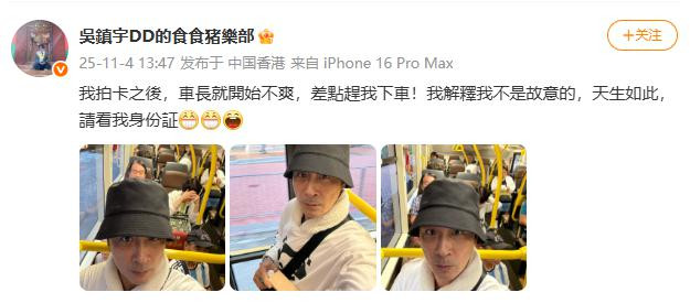 11月4日,吴镇宇在社交平台发文称使用公交老年卡时,因外貌显年轻被车长质疑“冒用他人证件”,甚至险些被赶下车。他当场掏出身份证自证年龄为63岁,并调侃:“看清楚,天生如此!”